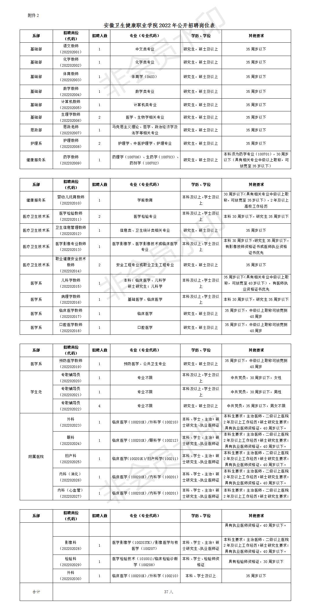 2.安徽卫生健康职业学院2022年公开招聘岗位表