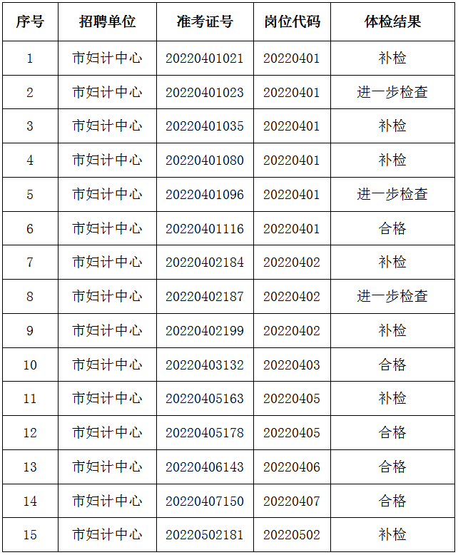 根据省委组织部、省人力资源和社会保障厅《关于印发<安徽省事业单位公开招聘人员暂行办法>的通知》(皖人社发〔2010〕78号)和《芜湖市妇幼保健计划生育服务中心(芜湖市妇幼保健院)2022年公开招聘编外工作人员(第二次)公告》及《芜湖市妇幼保健计划生育服务中心(芜湖市妇幼保健院)2022年公开补充招聘编外工作人员公告》等文件规定,经9月26日体检,现将体检结果公布如下: