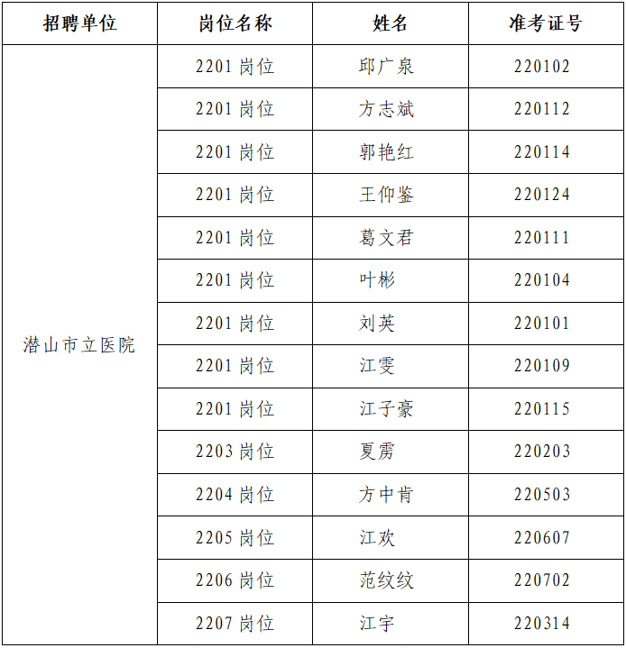 根据《2022年潜山市立医院面向高校现场招聘专业技术人员公告》规定,经报名、资格审核、面试、体检、考察、递补等程序,如下人员符合本次招聘条件,拟聘用为潜山市立医院卫生专业技术人员,现向社会公示。