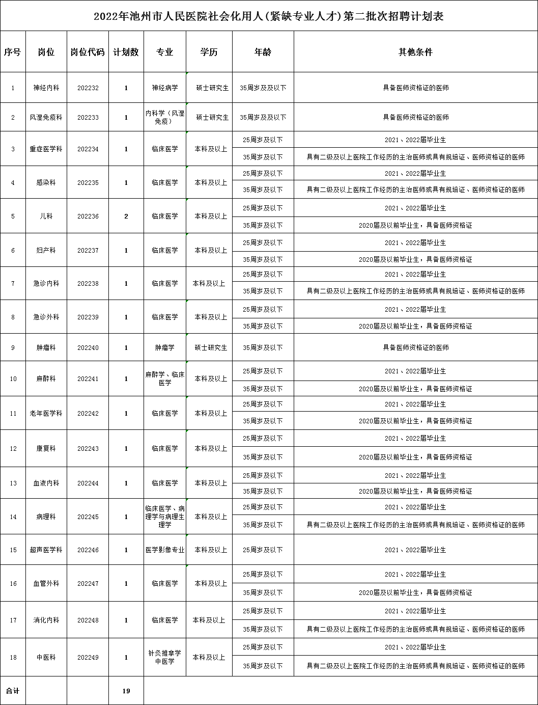 (一)本次招聘计划为19名,不纳入编制管理。招聘公告、岗位、条件等信息于2022年11月15日起在池州市人力资源和社会保障局网(http://czsrsj.chizhou.gov.cn)、池州市人事考试网站(http://rskszx.czsrsj.chizhou.gov.cn)、池州市人民医院网站(http://www.chizhouhospital.com)等网站上发布。