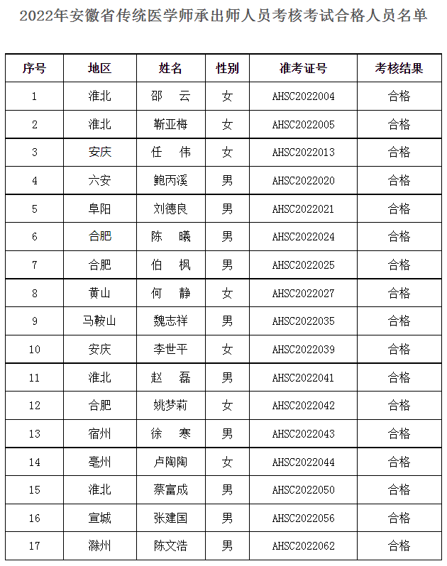 根据《传统医学师承和确有专长人员医师资格考核考试办法》《关于2022年安徽省传统医学出师考核和确有专长人员考核工作的通知》等文件要求,省中医药管理局组织传统医学期满出师人员考核考试。通过对期满出师人员资格审核、临床实践技能考核和综合笔试,现将考核考试合格人员邵云等17人进行公示(见附件)。