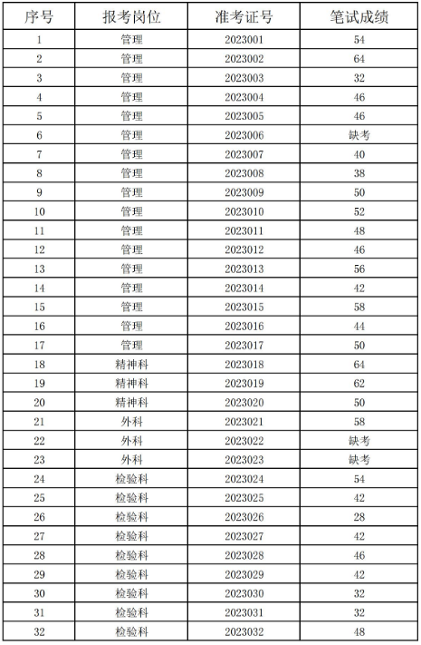 根据《太和县第二人民医院2023年下半年招聘公告》,我院2023年下半年招聘笔试工作于2023年11月3日完成。现将笔试成绩予以公布(见附件),公示期自2023年11月4日至11月10日,公示期间考生如有异议可向以下有关部门反映。