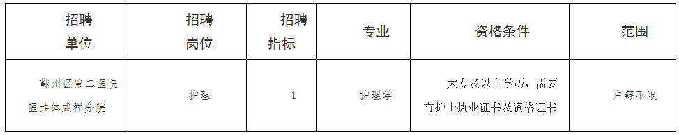 宁波市鄞州区第二医院医共体是由宁波市鄞州区第二医院医共体总院和鄞州三院,潘火街道、中河街道、下应街道、首南街道、钟公庙街道5家社区卫生服务中心,咸祥镇中心卫生院、茅山镇卫生院、塘溪镇卫生院等9家分院组成。根据有关规定及医疗业务发展需求,咸祥分院公开招聘编外(劳务派遣)工作人员1名。现将有关事项公告如下: