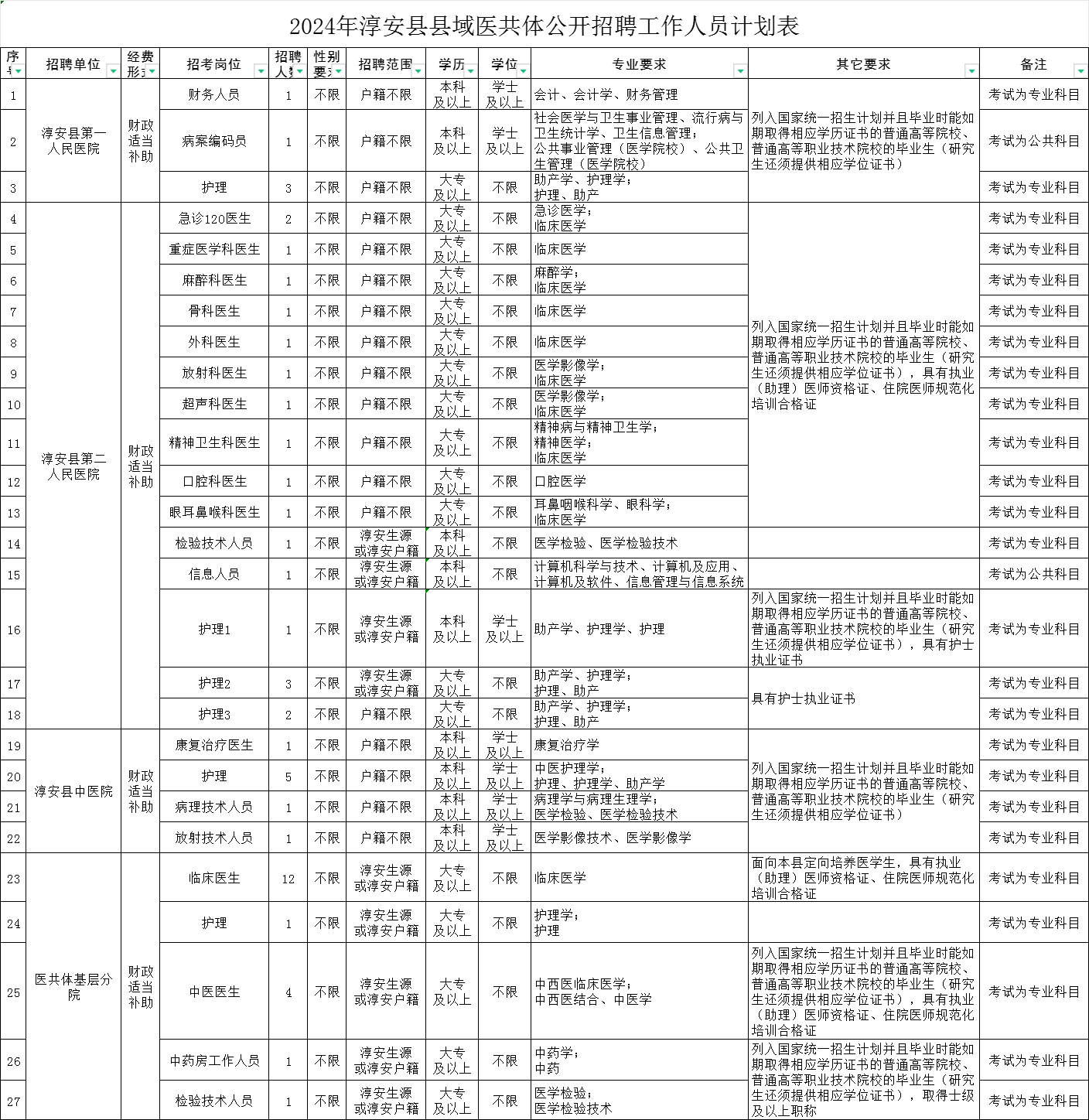 本次计划招聘工作人员51名。招聘单位、岗位、人数、条件及其他要求详见《2024年淳安县县域医共体公开招聘工作人员计划表》(附件1)。