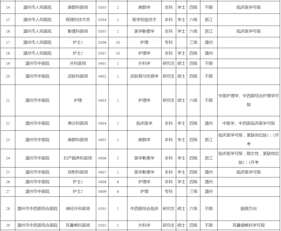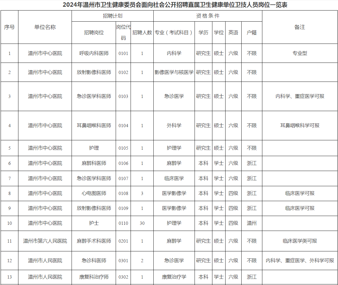 (一)用人单位、具体岗位及要求详见《2024年温州市卫生健康委员会面向社会公开招聘直属卫生健康单位卫技人员岗位一览表》(附件)。