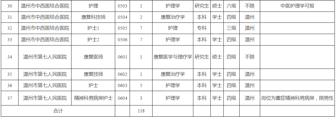 根据中共浙江省委组织部、浙江省人力资源和社会保障厅《关于进一步加强事业单位公开招聘工作的指导意见》(浙人社发〔2012〕194号)和《温州市事业单位公开招聘工作人员暂行办法》(温政办〔2006〕220号)精神,经研究决定,温州市卫生健康委员会面向社会公开招聘直属卫生健康单位118名事业编制的卫生专业技术人员,其中直属医院招聘使用事业编制报备员额,其人员统一执行事业单位各项人事管理制度,相关待遇及管理与使用事业编制的在编人员相同。现将有关事项公告如下: