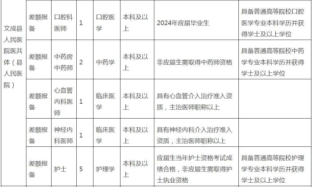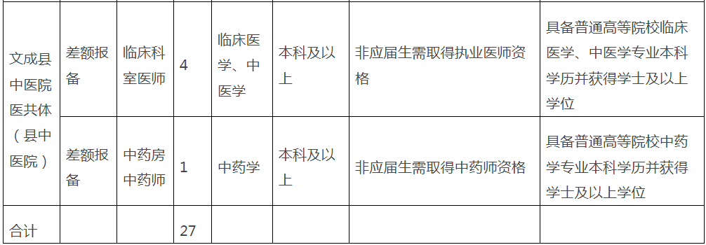 本次计划招聘卫生紧缺专业人才27名,具体岗位及要求详见《2024年文成县公开招聘卫生紧缺专业人才职位一览表》。