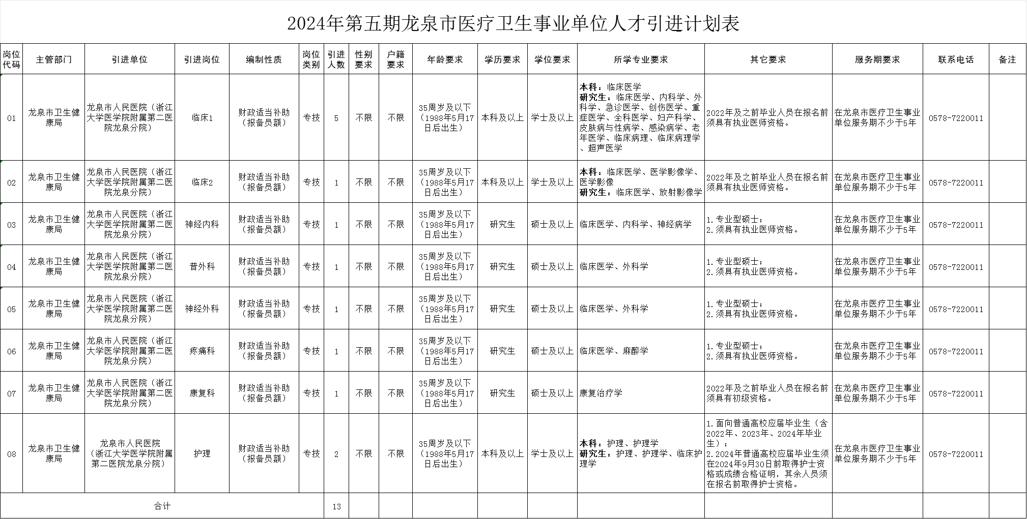 本次人才引进计划共13名,具体引进单位、岗位、人数和资格要求等详见附件1《2024年第五期龙泉市医疗卫生事业单位人才引进计划表》(以下简称计划表)。