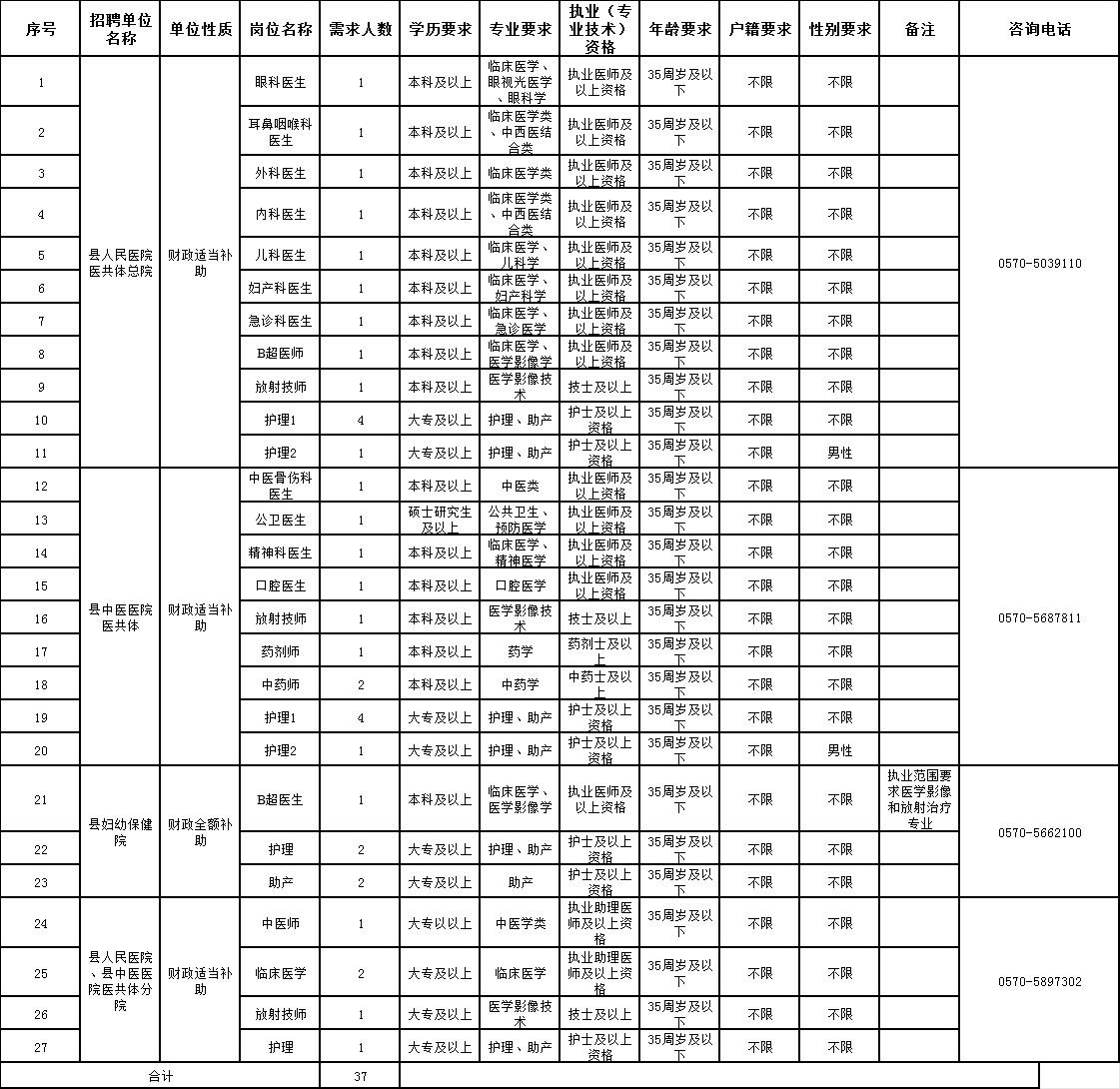 本次面向社会公开招聘卫健系统事业单位工作人员37人。具体招聘单位、岗位、人数和报考资格条件等详见《2024年常山县面向社会公开招考卫生专业技术人员计划表》(附件1)。