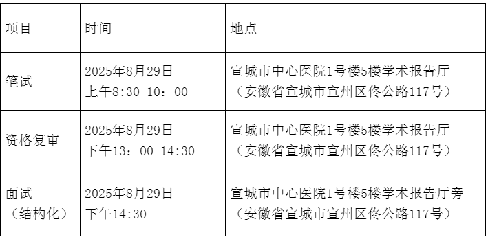 2.面试地点:宣城市中心医院1号楼5楼学术报告厅旁(安徽省宣城市宣州区佟公路117号)。