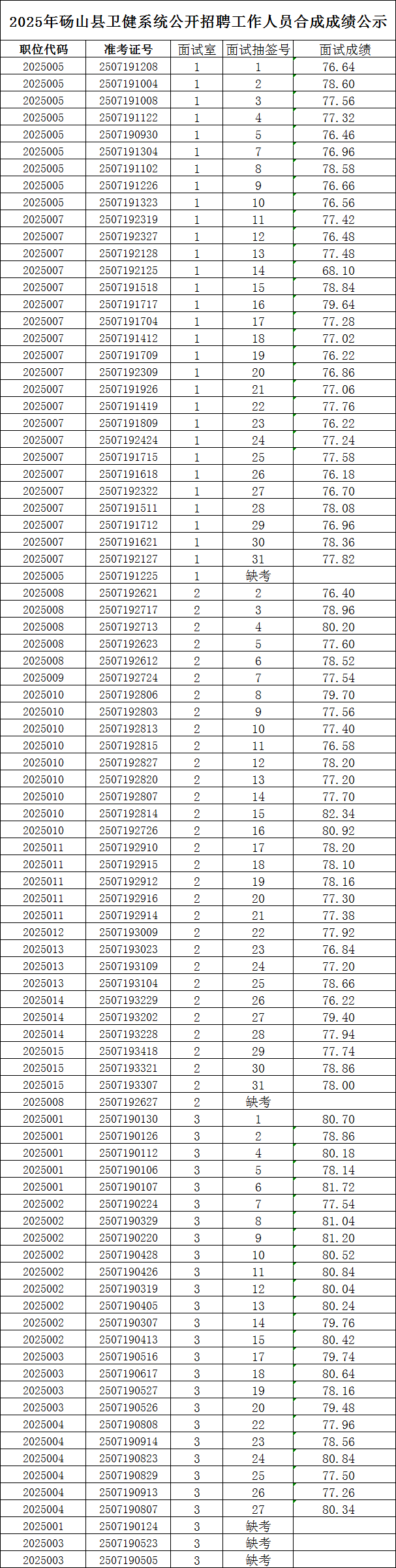 【面试成绩】2025年砀山县卫健系统公开招聘工作人员面试成绩公示