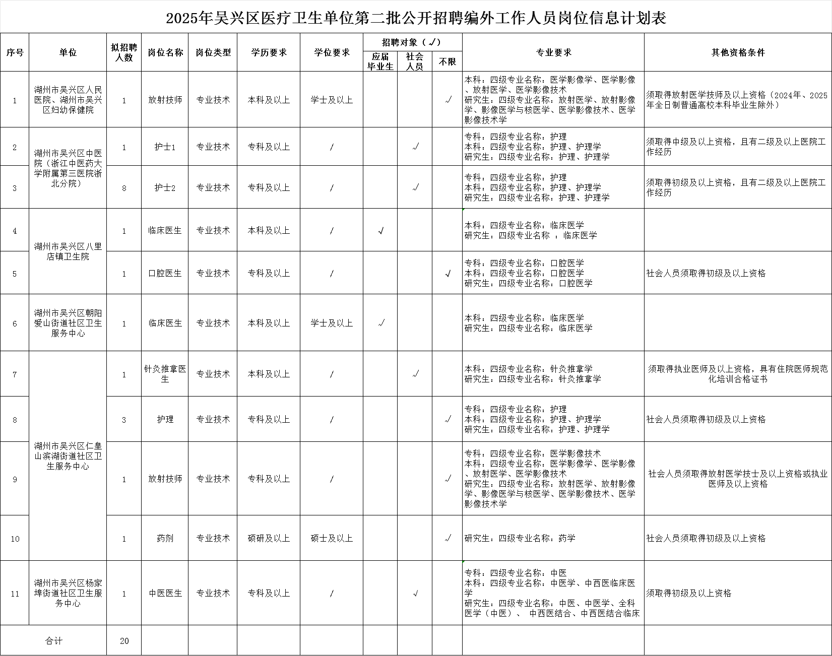 计划公开招聘医疗卫生单位编外工作人员20名,具体招聘单位、岗位、人数等详见《2025年吴兴区医疗卫生单位第二批公开招聘编外工作人员岗位信息表》(附件1)。