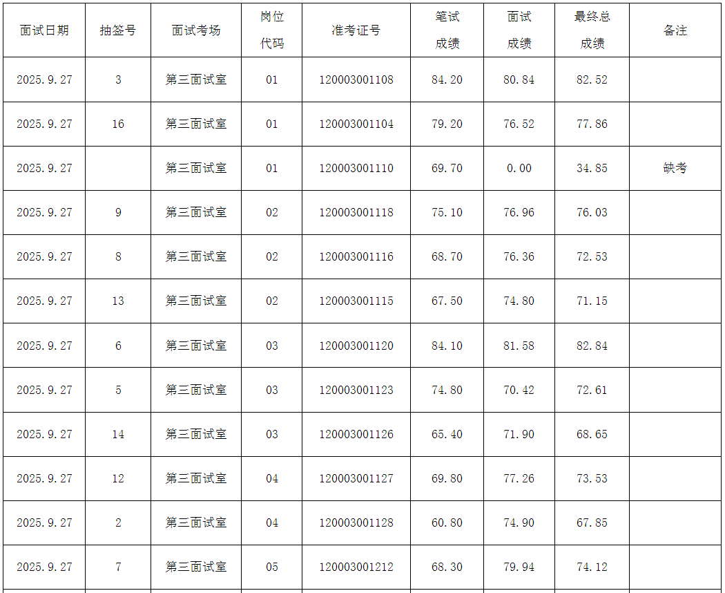 根据《2025年芜湖市繁昌区卫健系统公开招聘编外工作人员公告》等规定,经9月27日面试,现将面试成绩公告如下(详见附表)。
