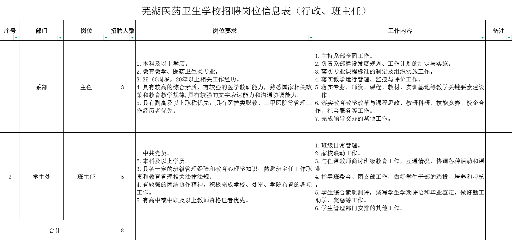 具体招聘要求详见《芜湖医药卫生学校招聘岗位信息表》(附件1)。