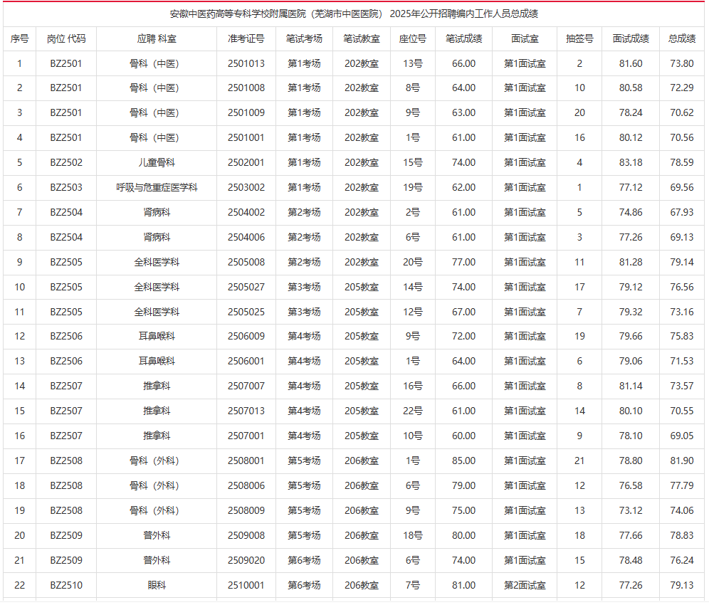 【成绩公告】2025年芜湖市中医医院招聘编内工作人员总成绩的公告