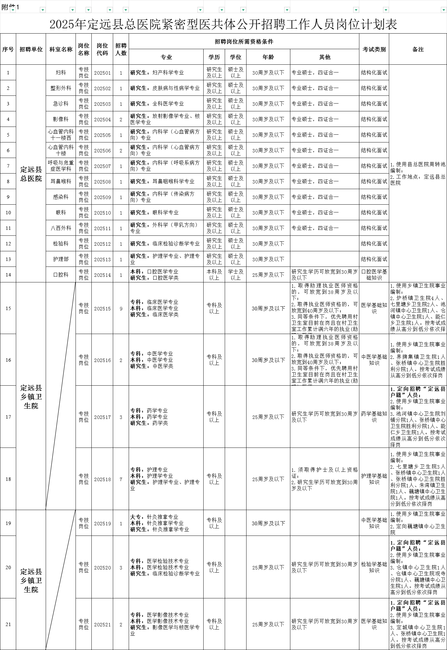 1.2025年定远县总医院紧密型医共体公开招聘工作人员岗位计划表