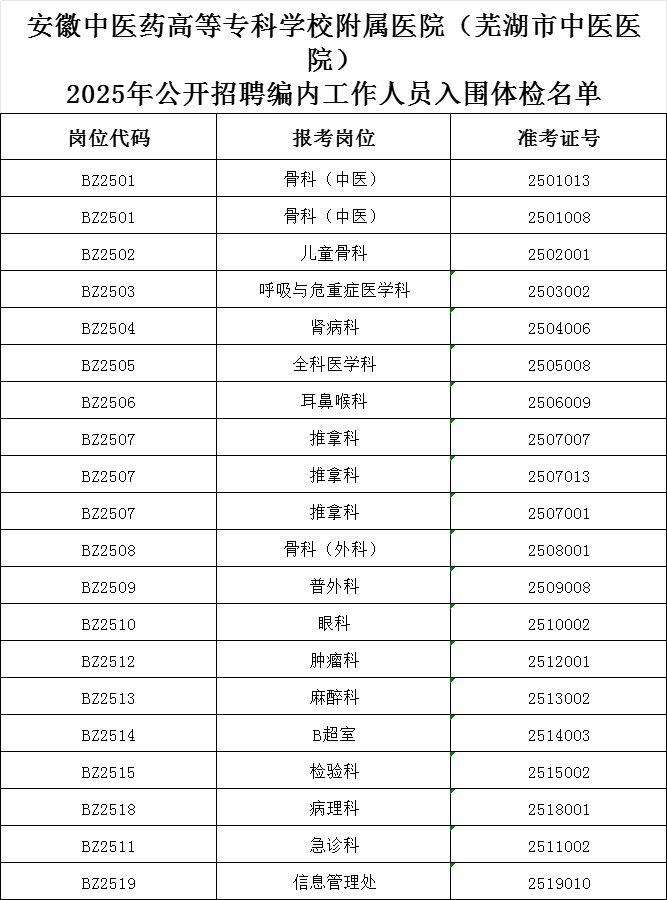 根据《安徽中医药高等专科学校附属医院(芜湖市中医医院)2025年公开招聘编内工作人员公告》规定,经现场资格审查、笔试、面试等程序,现将入围体检环节人员办理体检确认手续有关事项通知如下: