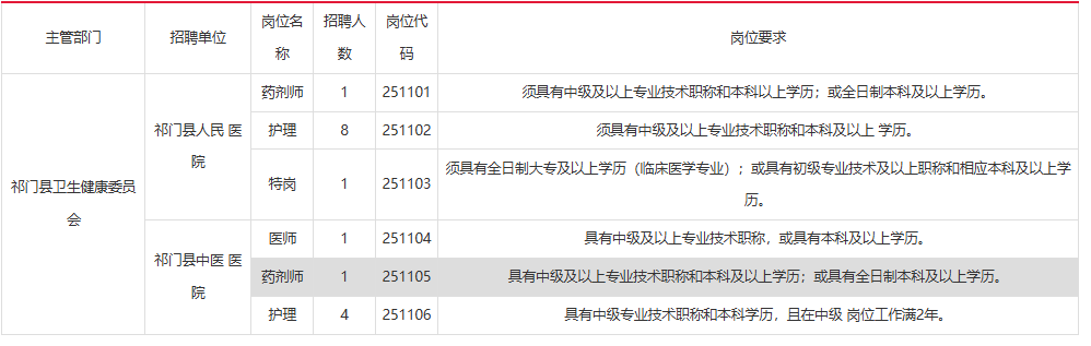 经县委、县政府同意,面向祁门县人民医院现有社会化人员(2025年8月1日以前进入祁门县人民医院的社会化人员)公开招聘公立医院周转池编制人员10名(药剂师1名,护理人员8名,特岗1名);面向祁门县中医医院现有社会化人员(2025年8月1日以前进入祁门县中医医院的社会化人员)公开招聘公立医院周转池编制人员6名(医师1名,药剂师1名,护理人员4名)。