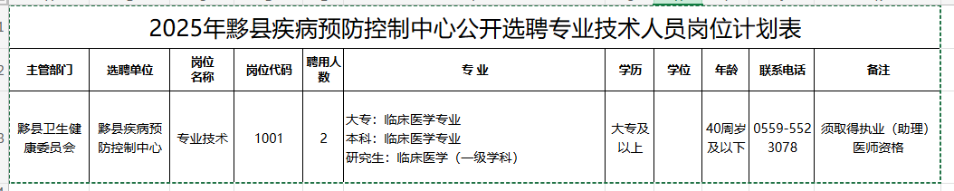 1.《2025年黟县疾病预防控制中心公开选聘专业技术人员岗位计划表》