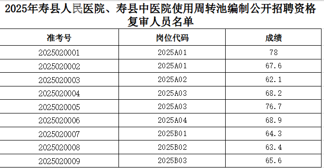 根据《2025年寿县人民医院、寿县中医院使用周转池编制公开招聘工作人员公告》,现将2025年寿县人民医院、寿县中医院使用周转池编制公开招聘工作人员入围资格复审人员名单及资格复审相关工作通知如下: