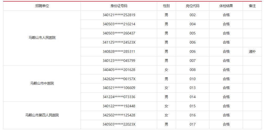 根据《2025年马鞍山市医疗卫生事业单位面向社会公开招聘工作人员公告》规定,现将2025年马鞍山市医疗卫生事业单位面向社会公开招聘工作人员考生体检结果公告如下: