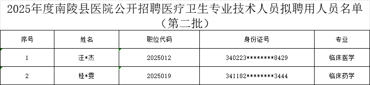 附件:2025年度南陵县医院公开招聘医疗卫生专业技术人员拟聘用人员名单(第二批).xlsx