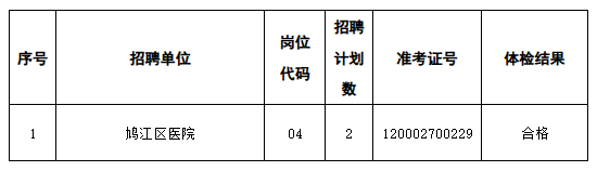 根据《2025年芜湖市鸠江区医疗卫生事业单位公开招聘工作人员公告》规定,经11月27日进行递补体检,现将体检结果(见附件)公示如下: