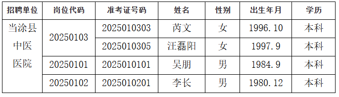 根据《2025年度当涂县中医医院招聘卫生专业技术人员公告》规定,芮文等4名考生经笔试、专业测试、体检、考察等程序,确定为当涂县中医医院的拟聘用人员,现予以公示: