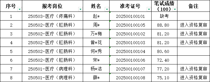 现将安徽中医药大学第一附属医院2025年部分紧缺岗位笔试成绩公布(见附件),招聘岗位根据笔试成绩高低按照1:3的比例进行资格复审,现将资格复审、技能考试相关事宜通知如下:
