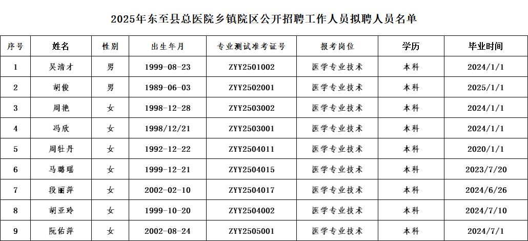 根据《2025年东至县总医院乡镇院区公开招聘工作人员公告》规定,经报名、资格审核、笔试、专业测试、体检、考察等程序,吴清才等9位同志符合招聘岗位条件,拟聘用为招聘岗位使用编制工作人员(详见附表),现予以公示,公示时间:2025年12月2日—2025年12月8日。如发现不符合应聘岗位条件的情况,请于公示期间向东至县人力资源和社会保障局、东至县纪检监察部门反映。