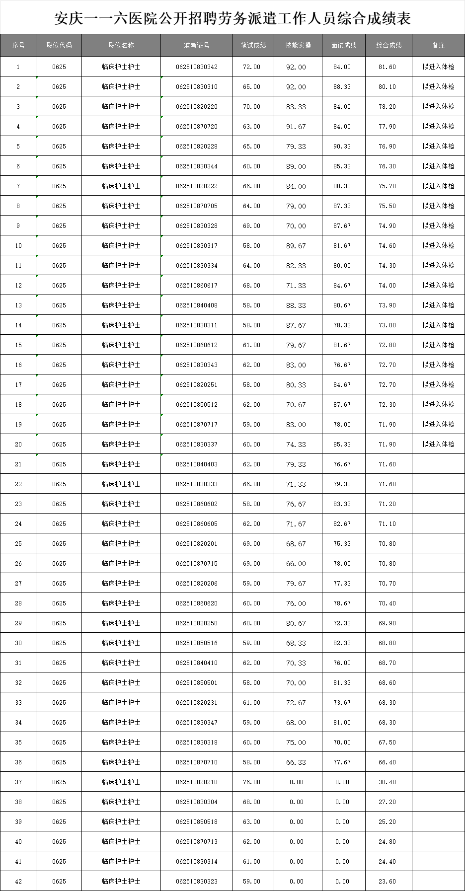 根据《安庆一一六医院公开招聘劳务派遣工作人员公告》的要求,相对安庆一一六医院公开招聘劳务派遣工作人员综合成绩予以公布。