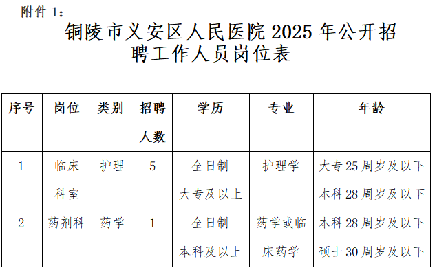 附件:1. 铜陵市义安区人民医院2025年公开招聘工作人员岗位表