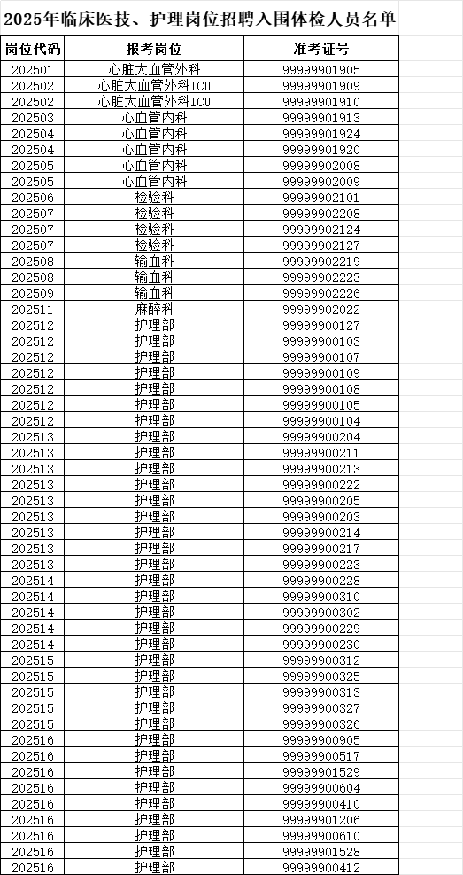 经过笔试、面试等环节,以下人员入围首都医科大学附属北京安贞医院安徽医院2025年临床医技、护理岗位招聘体检及考察环节(见附件)。请入围人员于2025年12月19日(周五)早上8:30携带本人身份证空腹至安徽医科大学第一附属医院高新院区健康管理中心5楼参加体检(合肥市蜀山区皖水路120号门诊楼乘坐43-46号电梯到达5楼体检接待大厅)。请按时参加,逾期不至视为自动放弃资格。此次体检为现场缴费,体检前请注意饮食清淡、不要饮酒。