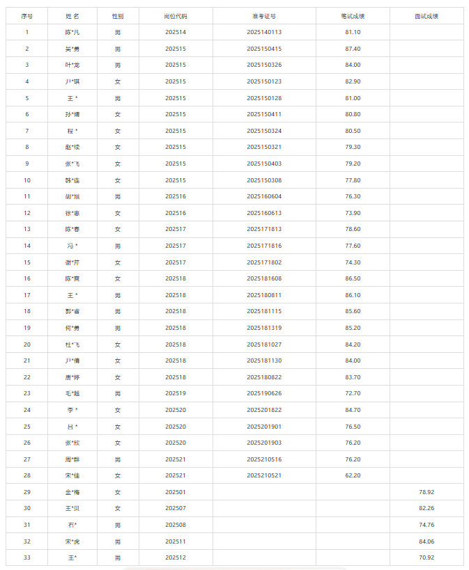 按照公告计划聘用人数,按考试成绩从高分到低分的顺序等额确定参加体检人选(除部分已放弃人员),体检人员名单见附件。