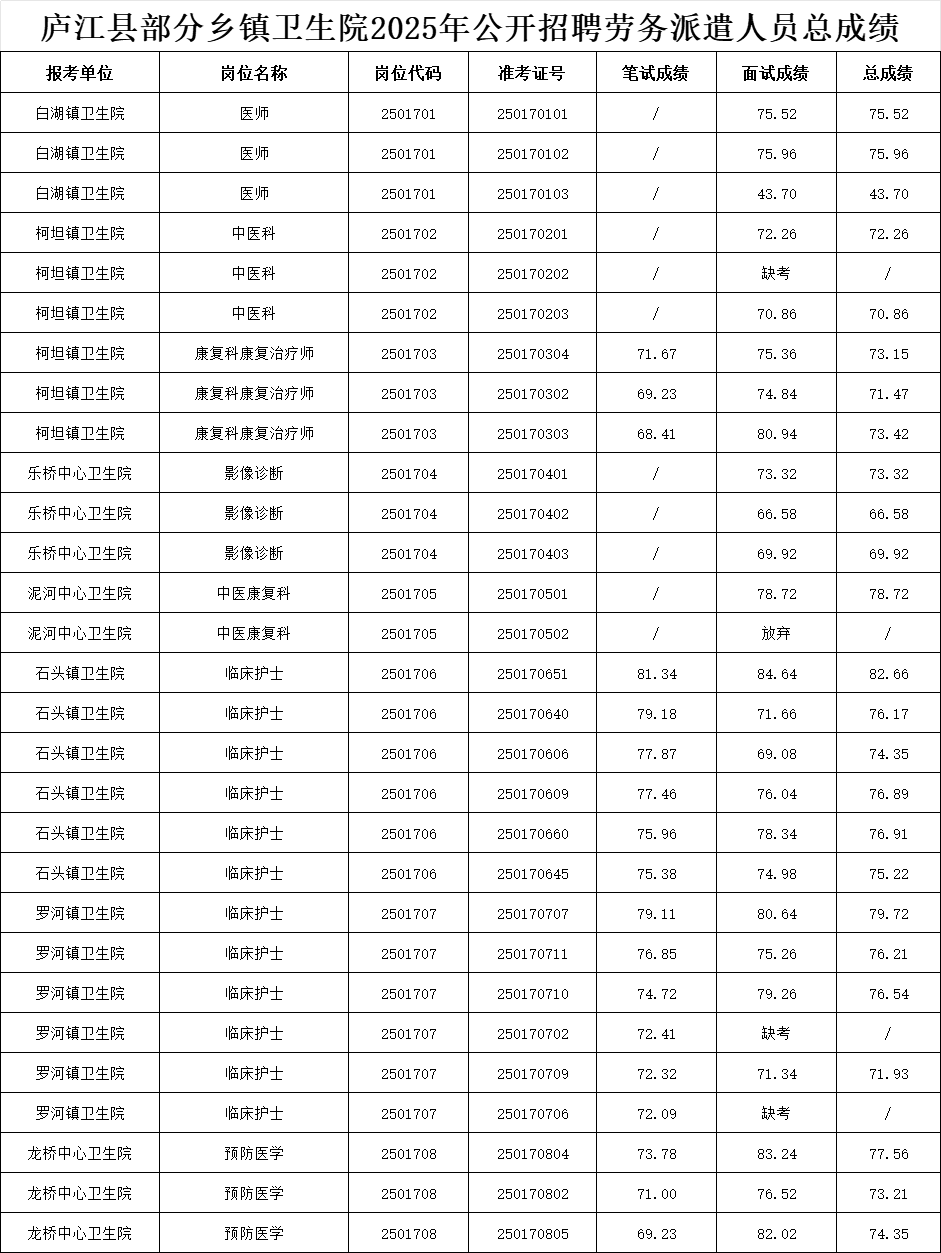 根据《庐江县部分乡镇卫生院2025年公开招聘劳务派遣人员公告》规定,现将总成绩予以公布(详见附件)。