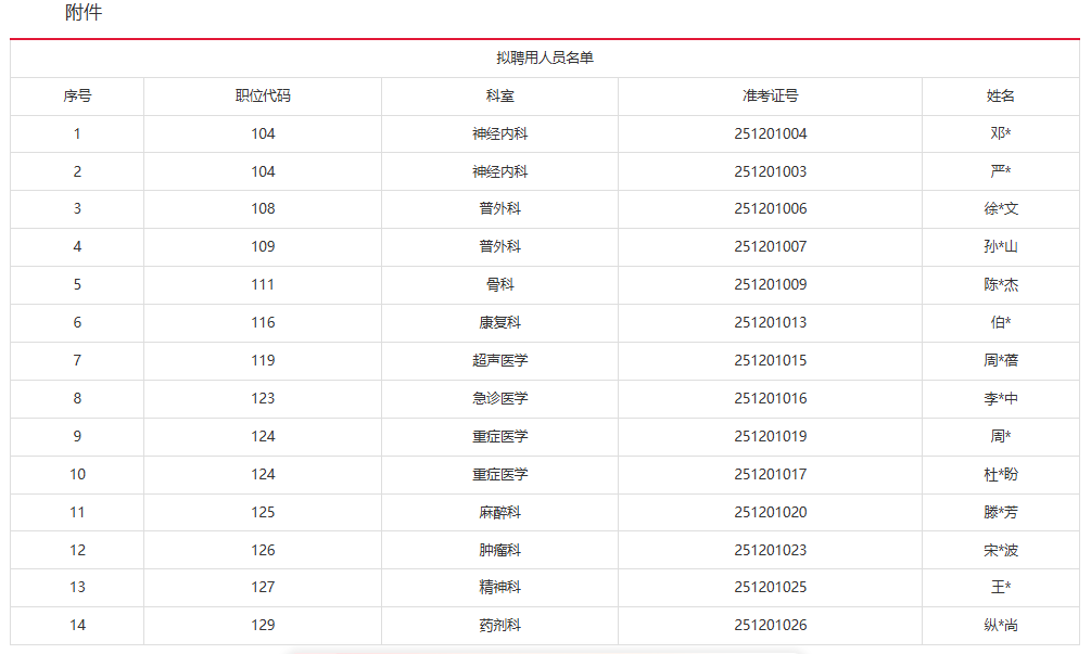 根据《安徽省事业单位公开招聘人员暂行办法》(皖人社发〔2010〕78号)和《宿州市第四人民医院(宿马医院)(浙江大学医学院附属第一医院宿州分院)2025年度引进专业技术人才公告》规定,报考事业单位的邓*等14名考生经笔试、专业测试、体检、考察等程序,符合本次公开招聘条件,拟聘用为事业单位工作人员,现将拟聘用人员名单(见附件)公示5个工作日。公示期间,如对拟聘用人选存有异议,请向宿州市人力资源和社会保障局反映。
