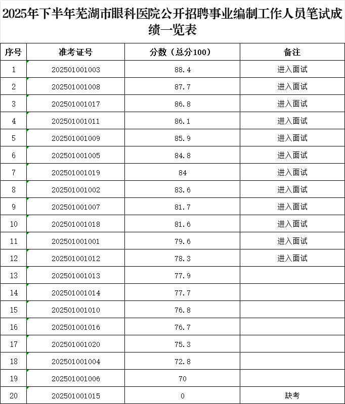 根据《2025年下半年芜湖市眼科医院公开招聘事业编制工作人员公告》,现将笔试成绩公布如下(见附件)。请各位考生注意查询。