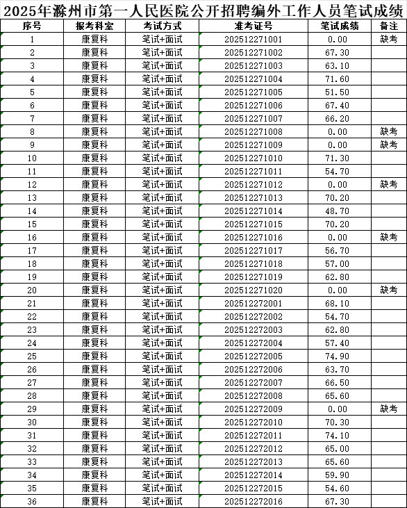 根据《2025年滁州市第一人民医院公开招聘编外工作人员公告》要求,现将笔试成绩进行公布(见附件),公示时间为2025年12月30日至2026年1月5日。如需查分,请于公示期间(工作时间)及时向滁州市第一人民医院人事科反映。