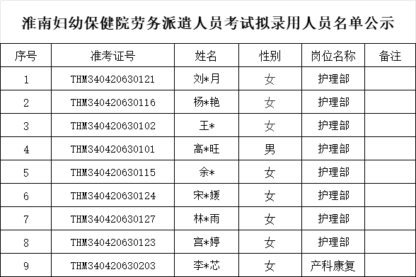 点击下载附件:淮南市妇幼保健院劳务派遣人员考试 拟录用人员名单公示