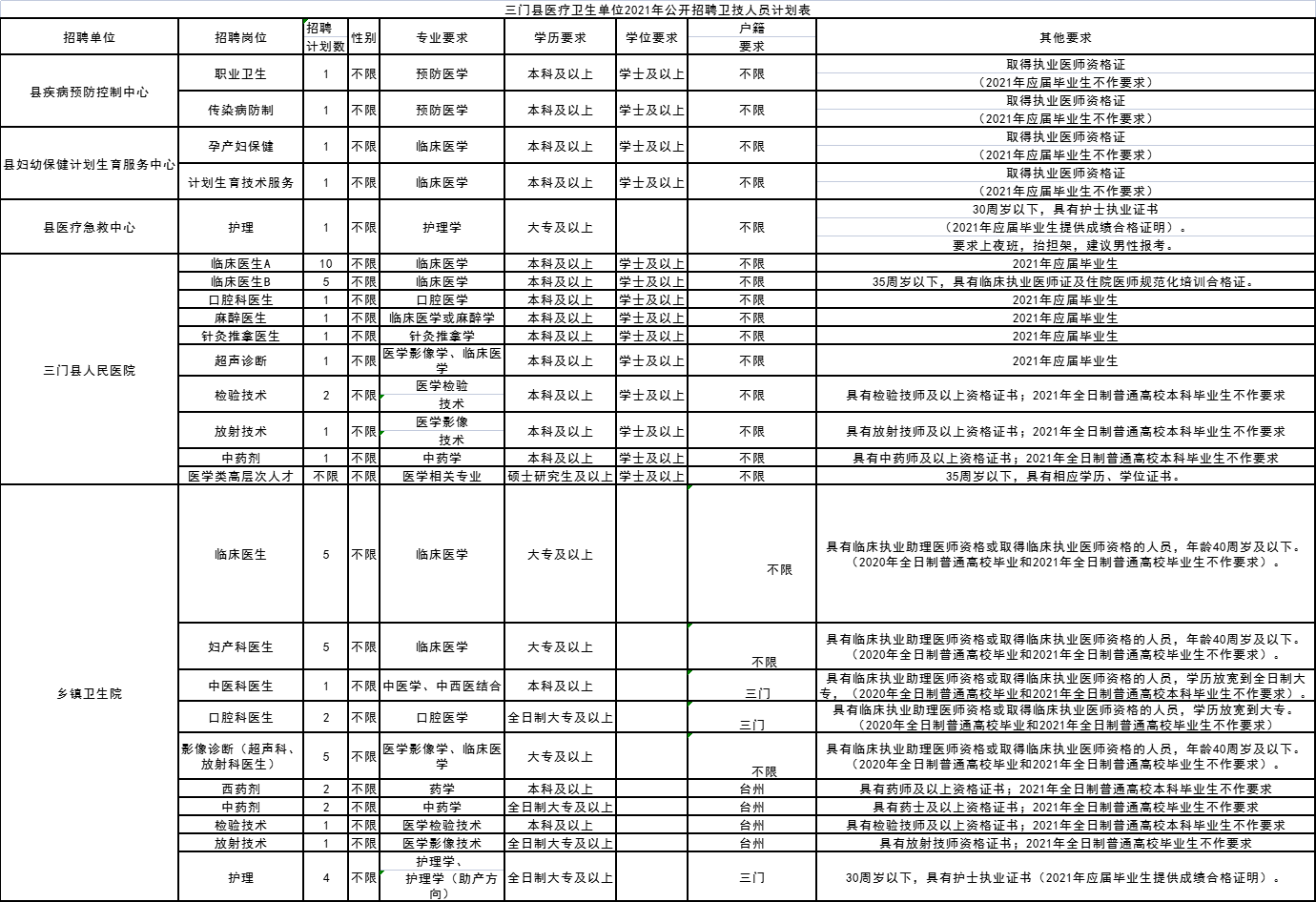 7.其他条件详见《三门县医疗卫生单位2021年公开招聘卫技人员计划表》(附件1),部分岗位对户籍、年龄、学历等条件另有要求的以《计划表》所列为准。