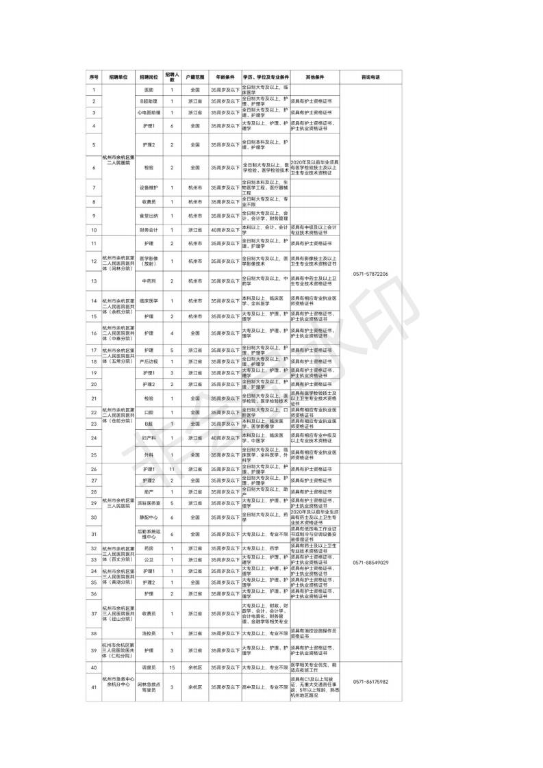 1、2021年杭州市余杭区卫生健康局部分事业单位公开招聘编外工作人员计划一览表