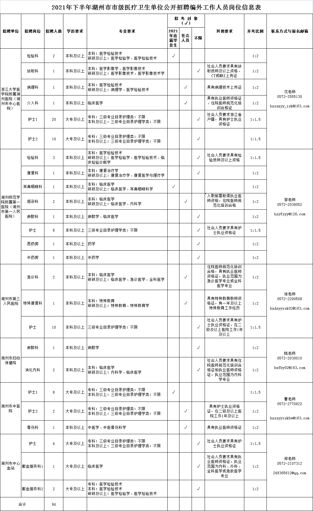 此次共计划招聘编外工作人员84名。具体招聘单位、岗位、人数和报考资格条件等详见《2021年下半年湖州市市级医疗卫生单位公开招聘编外工作人员岗位信息表》(附件1)