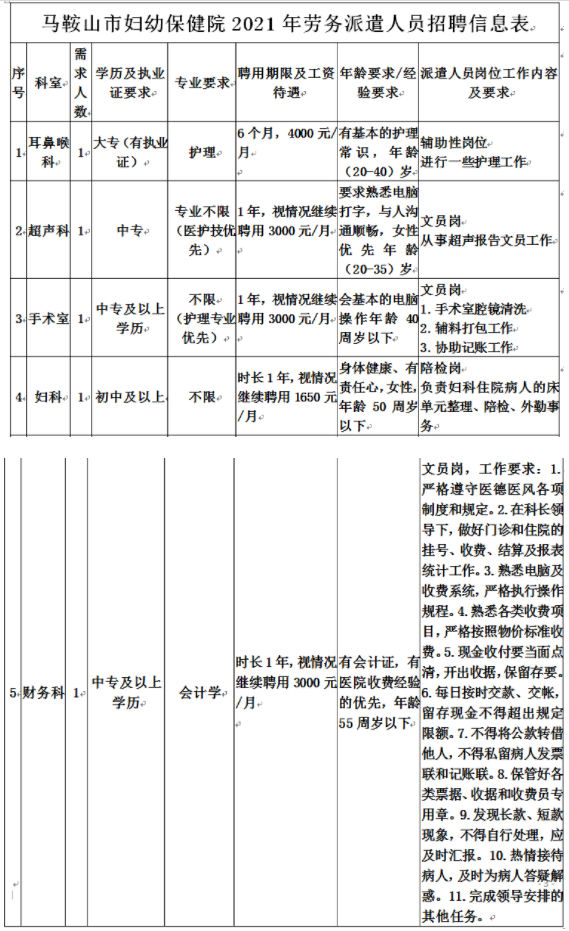 为进一步加强人才队伍建设,结合用人需求与医院实际,马鞍山市妇幼保健院委托劳动服务第三方“安徽华荣远诚人力资源服务集团有限公司”现面向社会公开招聘21名劳务派遣制医务辅助工作人员,工作单位“马鞍山市妇幼保健院”,欢迎广大优秀人才报名应聘。现就具体招聘事项公告如下: