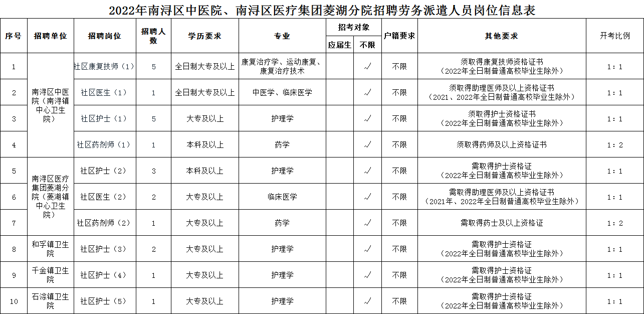 本次招聘共推出10个岗位,计划招聘22人。具体招聘要求详见《2022年南浔区中医院、南浔区医疗集团菱湖分院招聘劳务派遣人员岗位信息表》(附件1)。