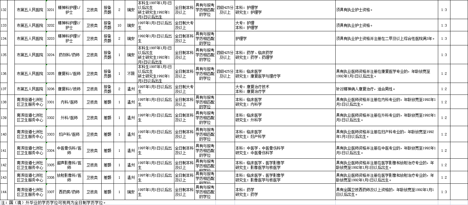 (一)招聘岗位及要求详见附件《2022年瑞安市医疗服务集团及其他医疗卫生单位面向社会公开招聘卫技人员岗位一览表》(附件1)。