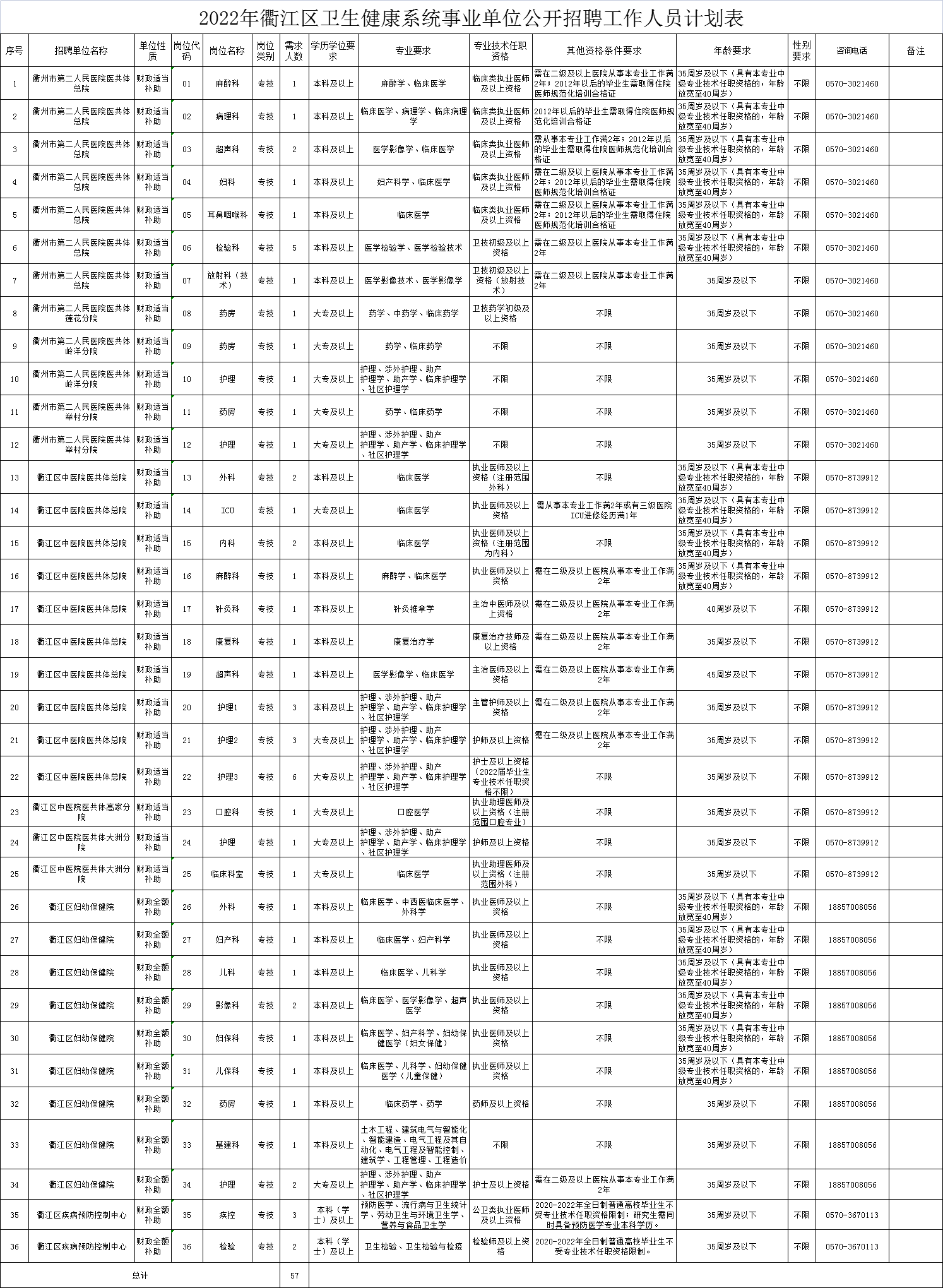 本次面向社会公开招聘卫生系统工作人员57人。具体招聘单位、岗位、人数和报考资格条件详见《2022年衢州市衢江区卫生健康系统事业单位公开招聘工作人员计划表》。