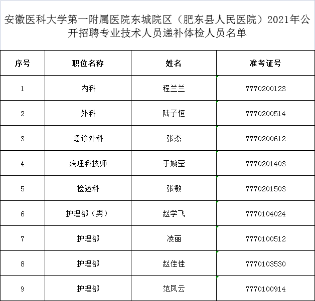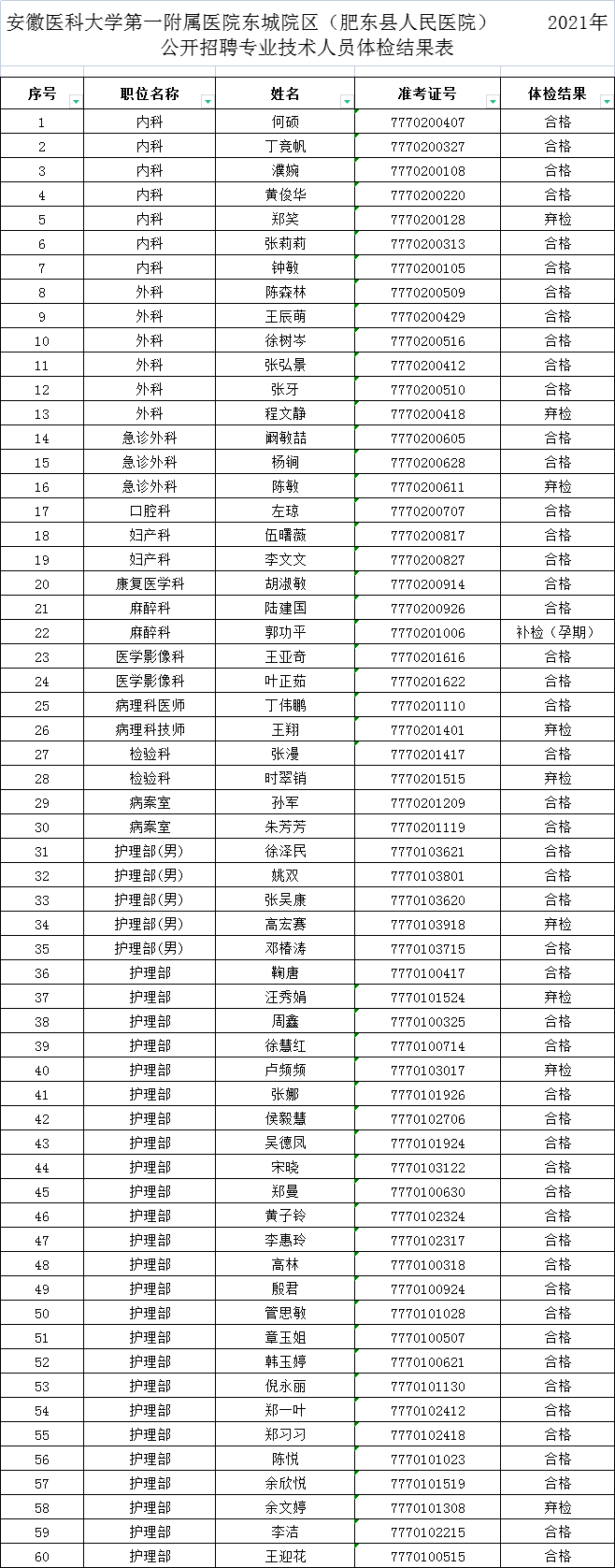 根据《安徽医科大学第一附属医院东城院区(肥东县人民医院)2021年公开招聘专业技术人员公告》要求,体检人员自动放弃或体检不合格的,在同岗位考生中按合成总成绩从高分到低分依次等额递补。