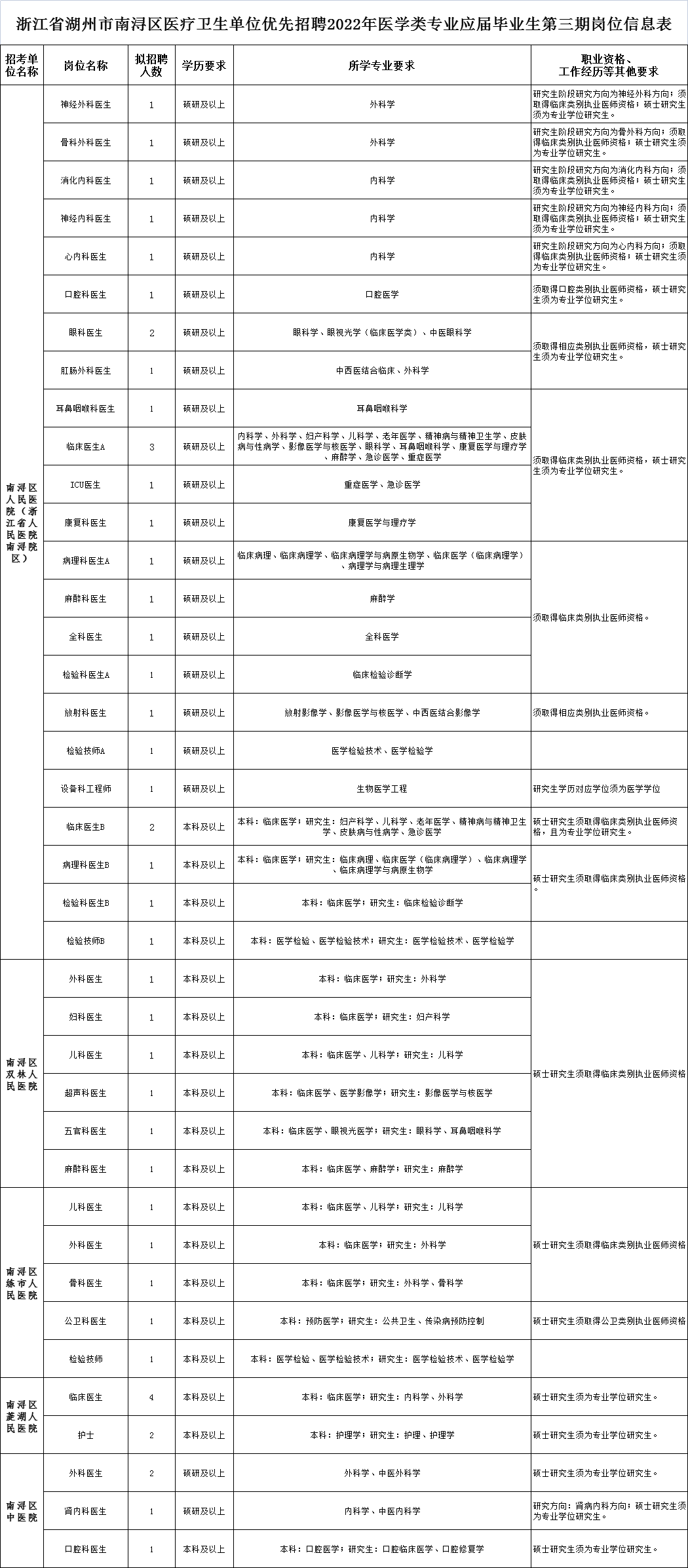 根据《南太湖医疗卫生领军人才引进实施办法》、《关于进一步加强卫技人才引育工作的实施意见》等有关规定,现就湖州市南浔区医疗卫生事业单位优先招聘2022年医学类专业应届毕业生具体事项公告如下: