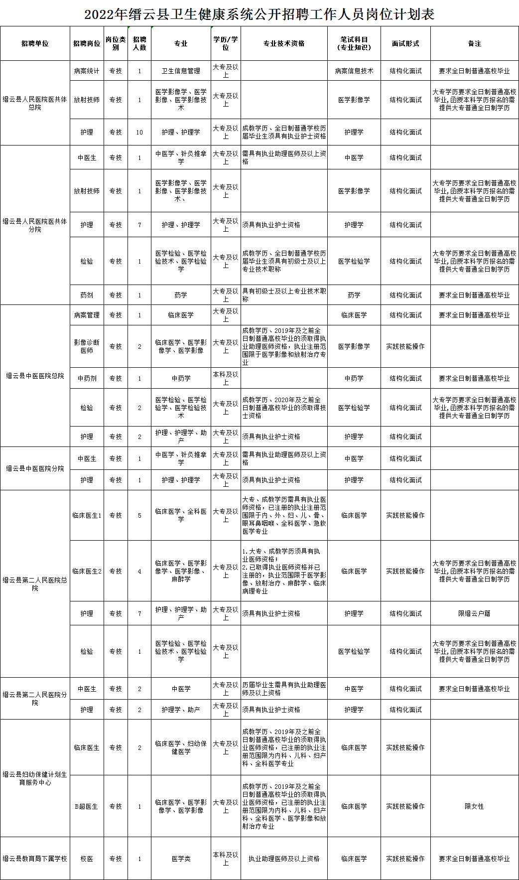 全县卫生健康系统计划公开招聘专业技术工作人员57名,县教育局下属学校公开招聘校医1名。具体的招考单位、对象、岗位、人数和报考资格等详见《2022年缙云县卫生健康系统公开招聘工作人员岗位计划表》(附件1),也可登录缙云县政府门户网站(http://www.jinyun.gov.cn)查询(文中“网上”就指该网站)。