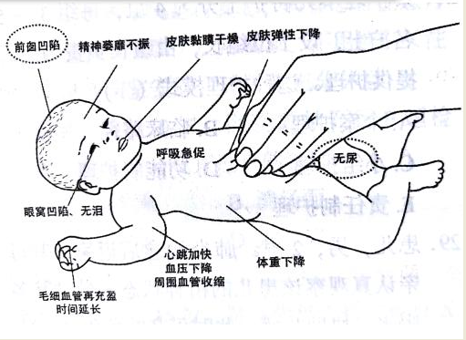 4.患儿男,6个月。腹泻3天,稀便每日20次左右,出现如图所示表现,其脱水程度是